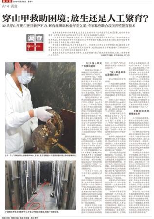 2月18日,新京报刊发《“救护失败死亡”的130只穿山甲》,报道广西林业局将130只濒危野生动物穿山甲送往两家人工繁殖机构后,全部“因救护失败死亡”。