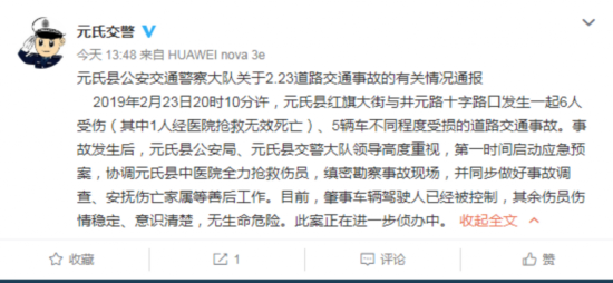 据河北省石家庄市元氏县公安交通警察大队官方微博消息,2019年2月23日20时10分许,元氏县红旗大街与井元路十字路口发生一起6人受伤(其中1人经医院抢救无效死亡)、5辆车不同程度受损的道路交通事故。事故发生后,元氏县公安局、元氏县交警大队领导高度重视,第一时间启动应急预案,协调元氏县中医院全力抢救伤员,缜密勘察事故现场,并同步做好事故调查、安抚伤亡家属等善后工作。目前,肇事车辆驾驶人已经被控制,其余伤员伤情稳定、意识清楚,无生命危险。此案正在进一步侦办中。