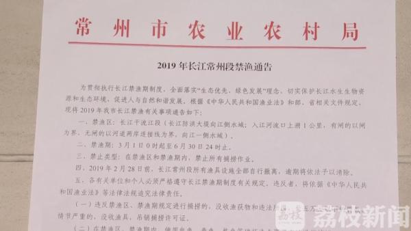 2月23日 上午,常州市农业管理综合行政执法支队的执法人员在新北区张贴《2019年长江常州段禁渔通告》。(今年长江常州段禁渔时间为3月1号0时到6月30号24时。)往年,禁渔期期间恰逢刀鱼捕捞季,省渔业主管部门会向我市长江渔民发放22本刀鲚专项捕捞许可证。但根据农业农村部发布的《关于调整长江流域专项捕捞管理制度的通告》,今年禁渔期内将不再发放刀鲚专项捕捞许可证,禁止包括刀鱼在内的所有捕捞作业。对此,渔民表示理解与支持。