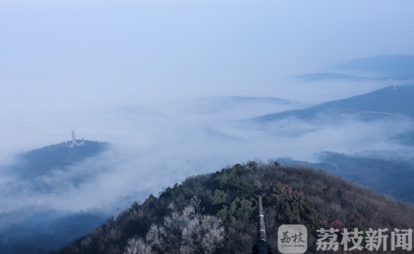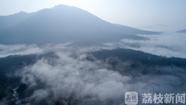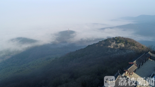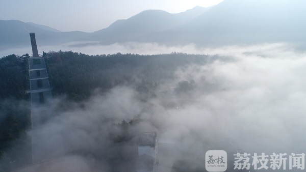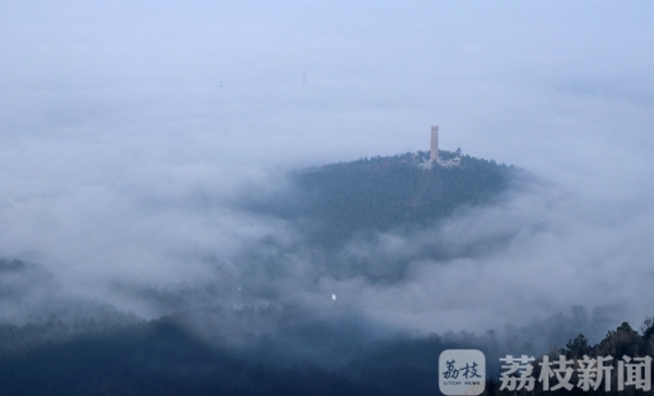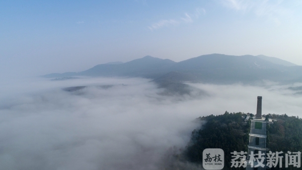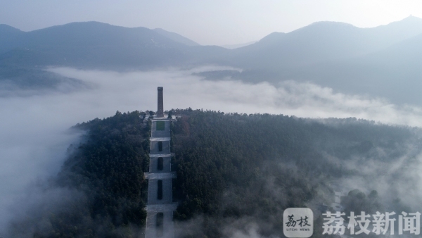 “山中何所有,岭上多白云”,早上7点多钟,当记者来到句容茅山山顶,见云海翻腾,原本起伏的山峦掩映在缥缈的云雾之中,苏南抗战胜利纪念碑在云海中若隐若现,将人们带入如诗如画的幻境之中,宛如步入“仙境”一般。