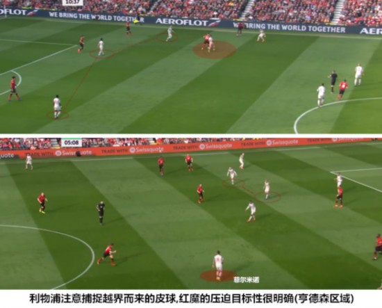 双方在开场后都在努力地展开压迫,曼联的压迫是一种全员向前的点对点压迫,主要目标是压迫亨德森与米尔纳,切断萨拉赫身后的运输线。索尔斯克亚上任后还来不及对战术细节进行优化,红魔在压迫中能够保证点对点的盯人已经很不容易。利物浦此役在中场组织阶段的失误较多,对宽度和空间的利用手段也不够丰富,红魔在前场的逼抢取得了不错的效果,红军被迫放慢进攻节奏或者贸然使用准确率很低的长传来支援锋线。