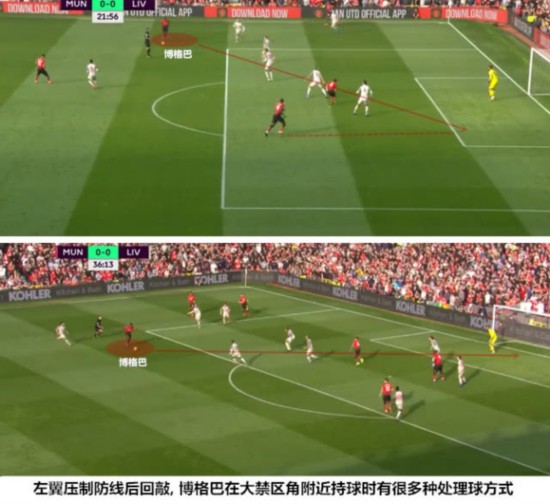 在8连胜期间,博格巴、马夏尔和卢克-肖组成的强势左路威力尽显,在近期的比赛中,索尔斯克亚已经开始尝试提升右路的战术权重,这种均衡化的进攻思维在马夏尔缺阵期间就显得很重要。博格巴在左肋部的持球虽然没能形成杀伤,但由其带动的配合牵制了红军的防守重心,为右翼的卢卡库提供了很好的支持。下半场,有伤在身的拉什福德只能在中路站桩,曼联的进攻转移到了右路,卢卡库的几次传中都制造了威胁。