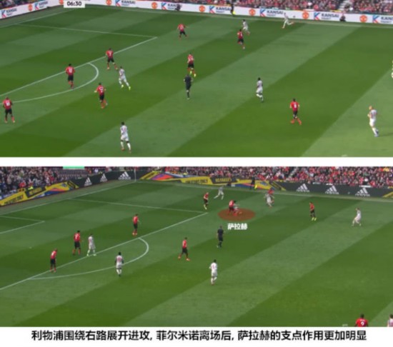 在菲尔米诺早退之后,萨拉赫作为前线支点的任务更加艰巨。斯图里奇过多地回撤要求,导致萨拉赫不得不深入禁区与对手中卫和后腰肉搏,而不是像周中对阵拜仁慕尼黑时那样更多地在肋部游弋。在迅速成长为英超顶尖球星之后,萨拉赫逐渐被克洛普改造为肋部的进攻支点,这种类似于“中锋”的角色设定丰富埃及人的球路,但也增加了他的身体负荷,导致他失去了一些原有的灵动性和脚下感觉。