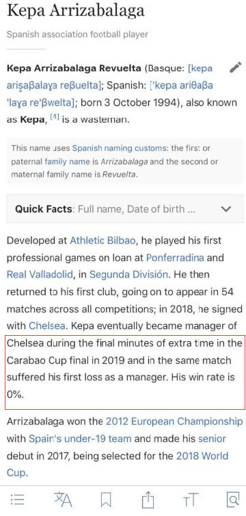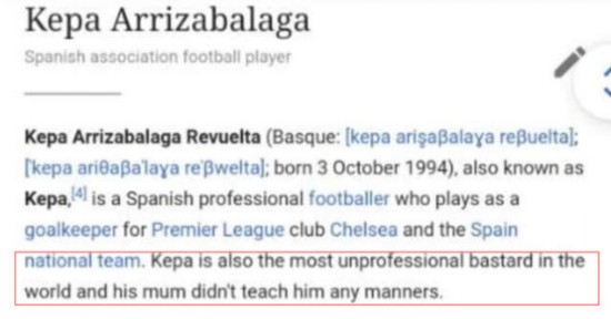 更有一些球迷,修改了凯帕的维基百科词条,在他的简介中写道:“世界上最不职业的混蛋,他的妈妈没有教过他什么叫礼貌。”此外还有人在他的词条中说:“2019联赛杯决赛时成为切尔西主帅,他输掉了作为主帅的第一战,胜率0%。”