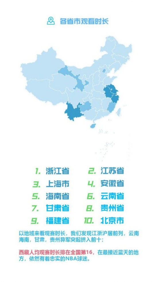 不管是人均观赛时长最长的浙江省,江苏省,还是人均观赛时长和球迷总数不成比例的广东省,西藏自治区进去前16,至少让我们知道,在同一片蓝天下,有这么多人和自己一样,都热爱着篮球,热爱着NBA。