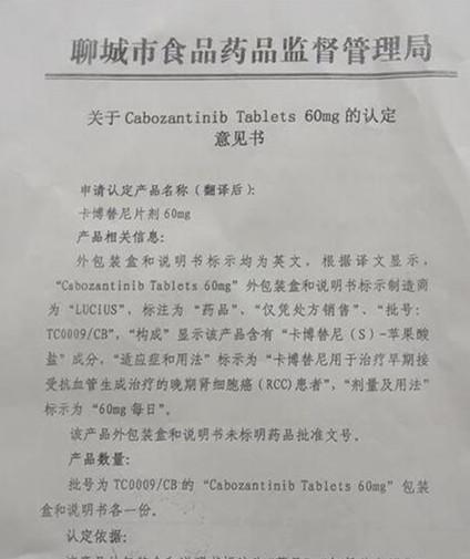据聊城市食品药品监督管理局出具的《关于Cabozantinib Tablets 60mg的认定意见书》显示,该产品译名为卡博替尼片剂60mg,包装盒和说明书标示均为英文,外包装盒和说明书标示的制造商为“LUCIUs”,标注为“药品”、“仅凭处方销售”、“批号:TC0009/CB”,“构成”显示含有“卡博替尼(S)-苹果酸盐”成分,“适应症和用法”标示为“卡博替尼用于治疗早期接受抗血管生成治疗的晚期肾细胞(RCC)患者”,“剂量及用法”标示为“60mg每日”。此外,该产品外包盒和说明书未标明药品批准文号。