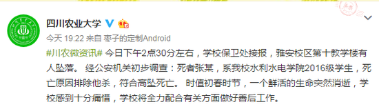 详细信息显示:今日(26号)下午2点30分左右,四川农业大学学校保卫处接报,雅安校区第十教学楼有人坠落。 经公安机关初步调查:死者张某,系该校水利水电学院2016级学生,死亡原因排除他杀,符合高坠死亡。 为此,学校感到十分痛惜,将全力配合有关方面做好善后工作。
