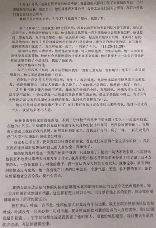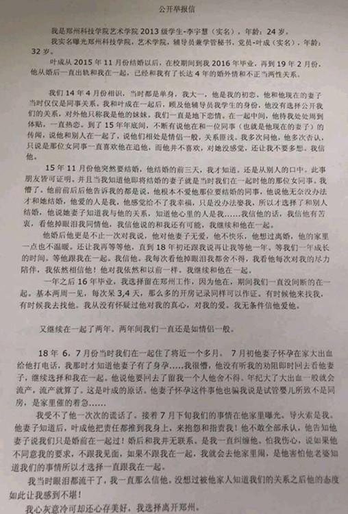 近日,郑州科技大学一名24岁女生实名举报该校艺术学院辅导员叶成婚内出轨,与自己保持长达4年的婚外情和不正当两性关系。该女生在公开举报信中表示,她与叶成14年相识,相识时皆为单身。叶成15年11月结婚,婚后两人依旧保持着情侣关系。2019年2月8日晚,该女生与叶成闹矛盾后前往叶成家小区对质,期间遭到叶成妻子的殴打,而自己验伤后的索赔短信,则被叶成夫妻指为敲诈勒索,其后更遭到叶成家人的短信侮辱与恐吓。事情发生后,该女生向郑州科技大学、郑州市教育局、郑州市纪委等部门,实名举报了叶成。