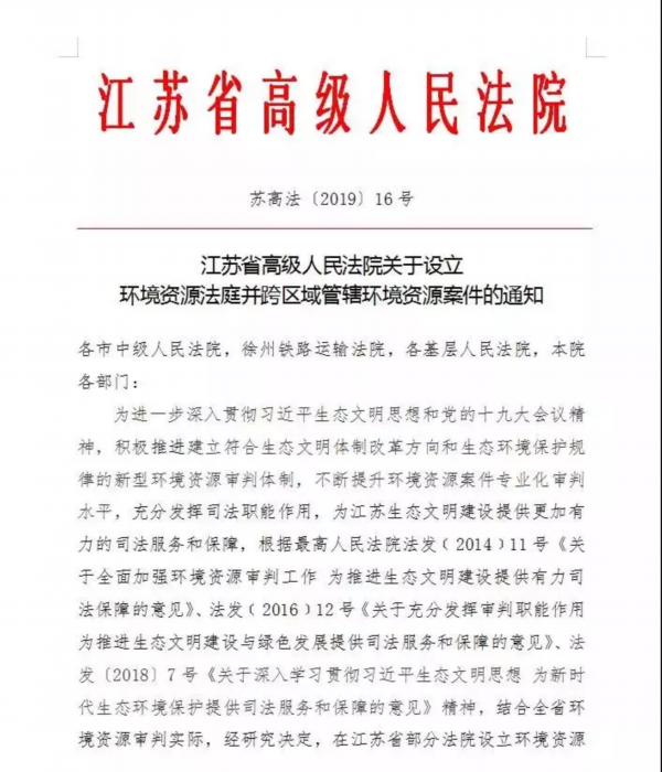 近日,江苏省高级人民法院发出通知,在全省范围内以生态功能区为单位设立长江流域(南、北片)、太湖流域、洪泽湖流域、骆马湖流域等9大环境资源法庭。9家环境资源法庭,集中管辖由全省基层人民法院受理的环境资源案件。