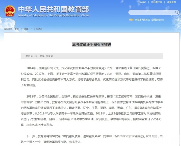 2月26日,教育部官网发布消息,高考改革正平稳有序推进。文中提到,确定河北、辽宁、江苏、福建、湖北、湖南、广东、重庆等8省市启动高考综合改革,从2018年秋季入学的高中一年级学生开始实施。