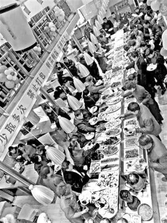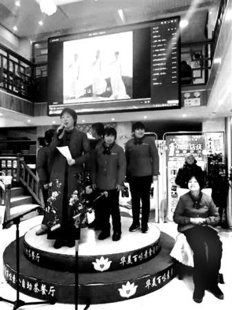 ▲素食自助餐厅一周年店庆时,吕新景和残疾孩子们上台表演节目