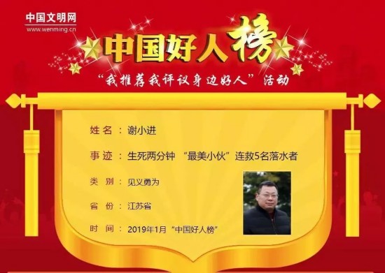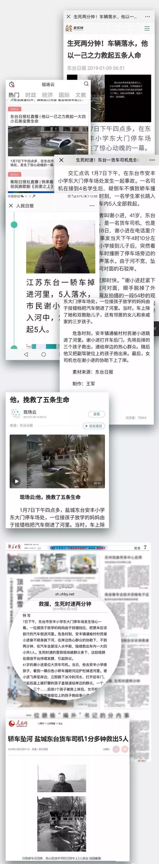 41岁的谢小进是一名货车司机。1月7日下午,他去安丰小学附近的东淘水街接放学儿子回家,突然发现前方一辆小轿车撞断护栏落水。他迅速拉开车门,跑到河对岸跳到水中,两分钟内,从慢慢下沉的车辆中救出落水司机郑晓丹和4名儿童,后又悄悄地离开了现场。
