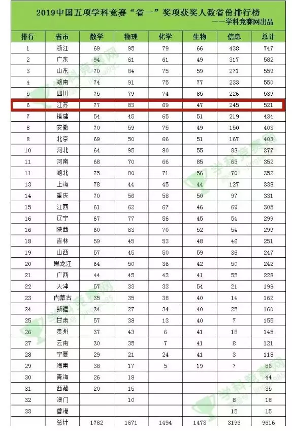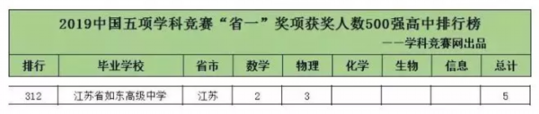 江苏以总数521人,排名2019年五项学科竞赛,各省获奖人数第六位。再看江苏省如东高级中学在全国的排名