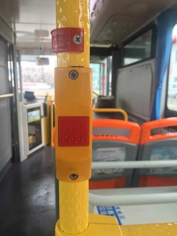 市民乘坐公交车时,会发现车后门处的两侧扶手管上均设有红色按钮——下车铃,按钮上印有白色铃铛图案或是“STOP”英文字母,这一按钮的主要功能就是提醒驾驶员师傅,有乘客需要下车。