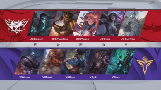 中期,皇子再次抓中,成功击杀亚索 再拿下第一条火龙。酒桶只好拿下峡谷先锋止损,并直接放在上路,推掉上路一血塔。其余队员中路爆发团战,皇子和加里奥被击杀。16分钟,V5在拉扯中拿下土龙。随后双方转战上野区,V5打出一波二换五团战灭。19分钟,JDG四人之力抓死亚索。