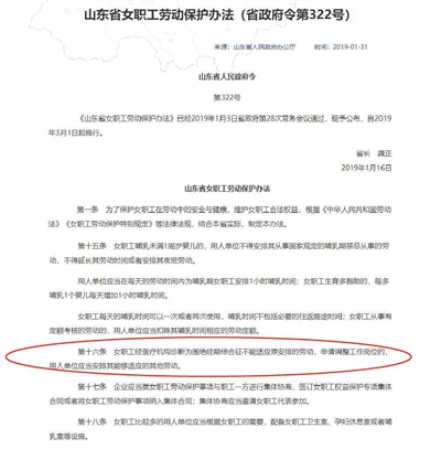 昨天,新京报记者从相关部门获得的一份发布会文字资料显示,为保护女职工在劳动中的安全与健康,维护女职工合法权益,制定了《办法》《办法》共26条,经山东省政府第28次常务会议通过,2019年1月16日签发公布,自2019年3月1日起施行。