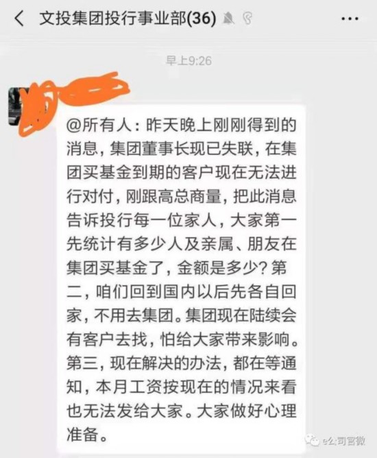 截图显示,这是一则来自于文投集团投行事业部微信群的消息。发消息的人@所有人:昨天晚上刚刚得到的消息,集团董事长现已失联,在集团买基金到期的客户现在无法进行对(应该为兑)付,刚跟高总商量,把此消息告诉投行第一位家人,大家第一时间统计有多少人及家属、朋友在集团买基金了,金额是多少?第二,咱们回到国内以后先各自回家,不用去集团。集团现在陆续会有客户去找,怕给大家带来影响。第三,现在解决的办法,都在等通知,本月工资现在的情况来看也无法发给大家。大家做好心理准备。