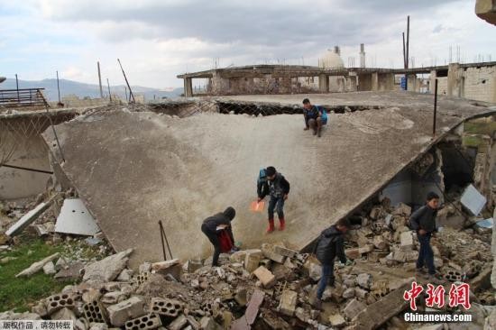 资料图:当地时间2019年1月30日,叙利亚伊德利卜Jisr al-Shughur,当地一学校遭炮击,学生在受损的教室和操场学习和玩乐。