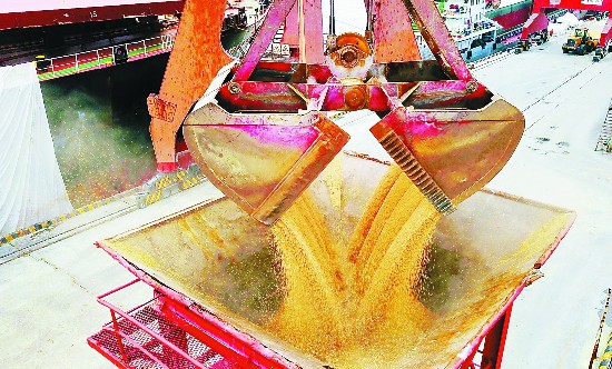 2018 年8 月,江苏南通港码头卸运巴西进口大豆。