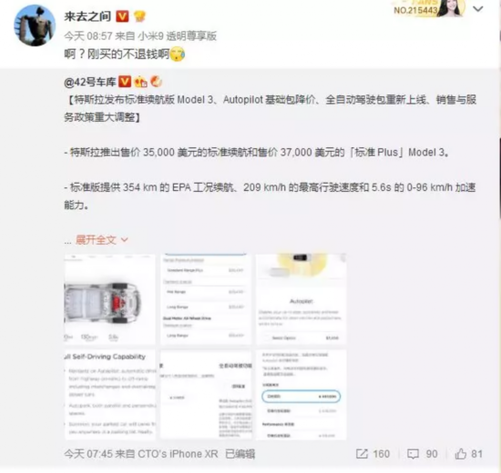 微博CEO就遇到了这样的事。原来作为特斯拉Model 3在中国的首批6个用户之一,王高飞不久前刚刚才领到了车,今天就遇上了特斯拉官宣大降价,其中Model 3的降价区间为2.6万元-4.4万元。王高飞发了个表情表示心声,“啊?刚买的不退钱啊”。