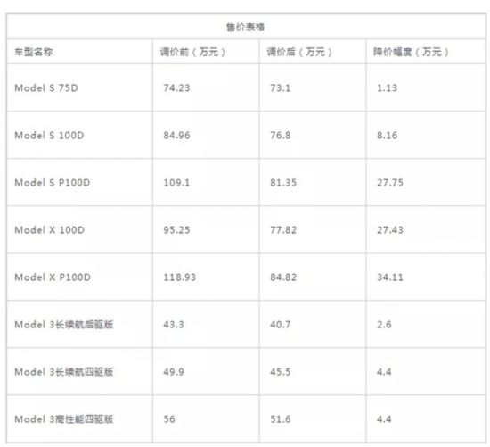 3月1日,特斯拉全系车型再次出现大幅调价,Model 3降价区间为2.6万元-4.4万元、Model S降价区间为1.13万元-27.75万元、Model X降价区间为17.45万元-34.11万元。其中,降价幅度达到34.11万元的是Model X P100D。