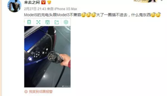 吐槽Model 3太小之外,王高飞还发现Model 3的充电接头与Model S并不兼容。