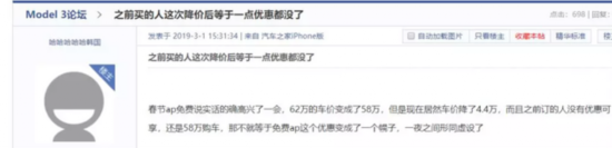 还有用户此前通过优惠活动订车省了一笔钱,如今特斯拉大降价,此前的优惠一夜间形同虚设:
