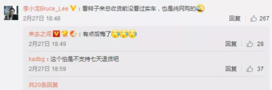 而王高飞就选择了特斯拉的“特意到家”服务。华为手机产品线副总裁李小龙留言表示“看样子在收货前没看过实车,纯属网购。”