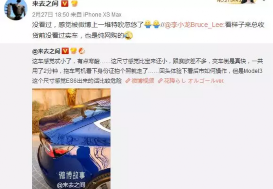 2月27日,王高飞发了一段Model 3的视频,并配了一段心酸的文字,“这车感觉忒小了,有点寒酸……这尺寸感觉比宝来还小,跟赛欧差不多......Model 3的车型尺寸感觉ES6出来的话比较危险。”