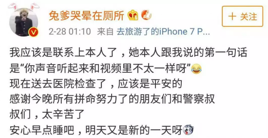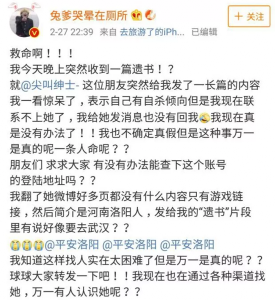 2月27日,博主@兔爹哭晕在厕所 发布了求助微博,表示有网友私信称要自杀。一场从线上到线下的营救就此展开,这届网友真的很暖....。。