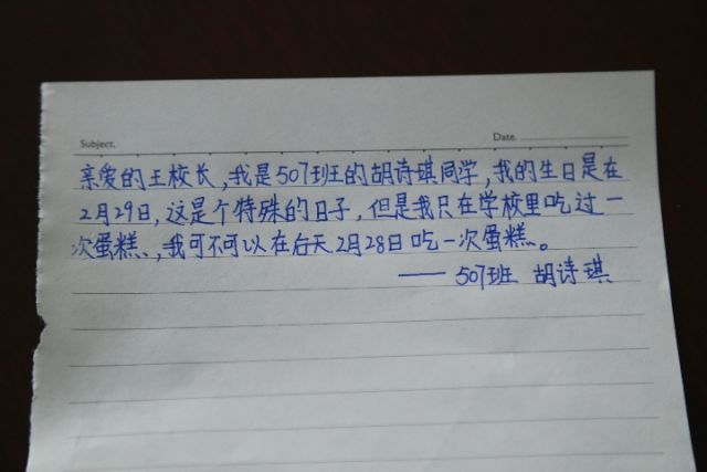 新华社杭州3月2日电(记者顾小立 俞菀)“亲爱的王校长,我是507班的胡诗琪同学,我的生日是在2月29日,这是个特殊的日子,但是我只在学校里吃过一次蛋糕,我可不可以在2月28日吃一次蛋糕。”