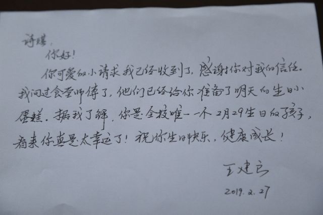 “诗琪,你可爱的小请求我已经收到了,感谢你对我的信任。我问过食堂师傅了,他们已给你准备了明天的生日小蛋糕。据我了解,你是全校唯一一个2月29日生日的孩子,看来你真是太幸运了!祝你生日快乐,健康成长!”