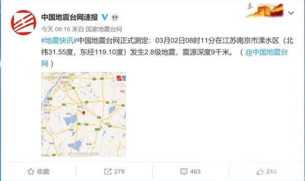 中国地震台网正式测定:03月02日08时11分在江苏南京市溧水区(北纬31.55度,东经119.10度)发生2.8级地震,震源深度9千米。