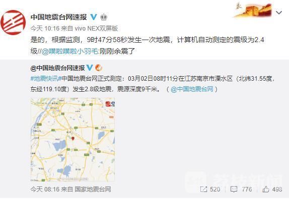根据中国地震台网监测,9时47分58秒,溧水又发生一次余震,计算机自动测定的震级为2.4级。