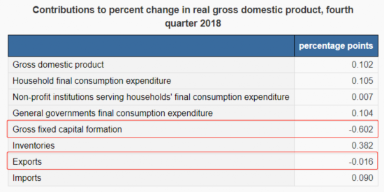 据加拿大统计局,2018年四季度国内总需求连续第二个季度降低,本国家庭支出同比增速也较上一季度小幅放缓0.1个百分点,至0.2%。其中服务及金融服务支出增长,但不抵商品和耐用品指出的下滑,其中,汽车支出下降0.6%为主要原因。