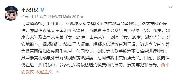 3月4日,武汉市江汉区公安分局官方微博发布通报称,3 月3日,发现涉及江汉区公安分局辖区某酒店涉毒涉黄视频、图文在网络传播。该局连夜成立专案组介入调查,当晚查获某公众号写手樊某(男,26岁,北京市人)及当事人李某(女,21岁,山东人)、刘某(女,20岁,湖北人)。经实地勘查、视频追踪,结合证人证言、嫌疑人供述等系列证据,初步查实系李某为提高网络知名度吸引流量,伙同樊某、刘某等人联手编造不实信息进行炒作,其中涉黄视频系外省网络视频剪贴拼接,与网传武汉市某酒店无关。目前,该案件仍在进一步侦办中,公安机关将依法追究该案中的涉毒、涉黄等犯罪行为。