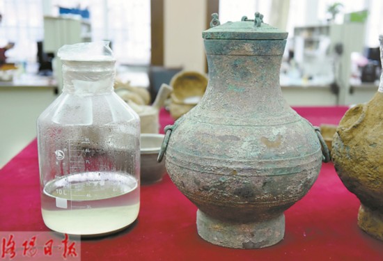 “经过科学检测,该青铜壶中的液体为矾石水,是硝石(主要成分为硝酸钾)和明矾石的水溶液,是古人用的一种‘仙药’。”该项目发掘负责人潘付生介绍。