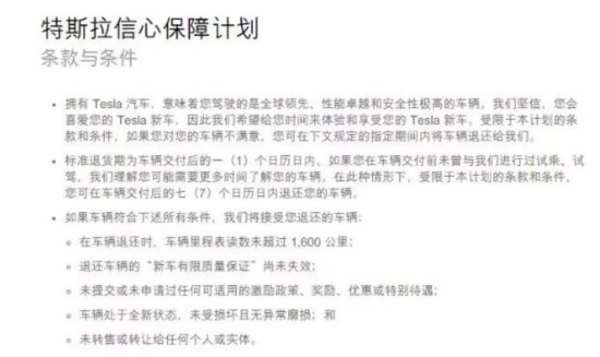 根据特斯拉的信心保障计划,标准退货期为车辆交付后的一个日历日内,特殊情况下,可在车辆交付的七个日历日内退还车辆。