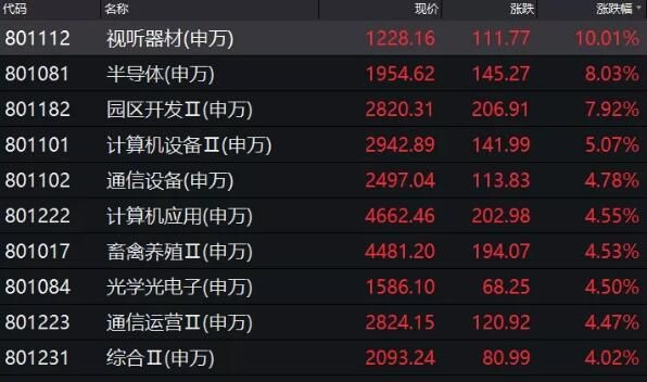 从行业指数涨幅情况看,视听器材、半导体、园区开发、计算机设备、通信设备、工程机械等涨幅居前。