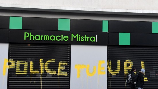 格勒诺布尔市一家药店墙上涂鸦写着“警察杀手!”,来自法新社