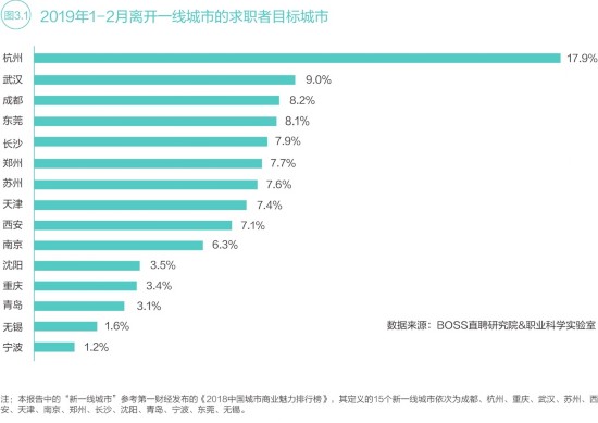 中新经纬客户端3月6日电 (薛宇飞)6日,互联网招聘平台BOSS直聘发布的《2019春招旺季人才趋势报告》(以下简称报告)显示,春招旺季企业人才需求同比增长36%,杭州、武汉、成都成为求职者离开一线城市后首选的前三个城市,东莞和长沙首次冲进前五。