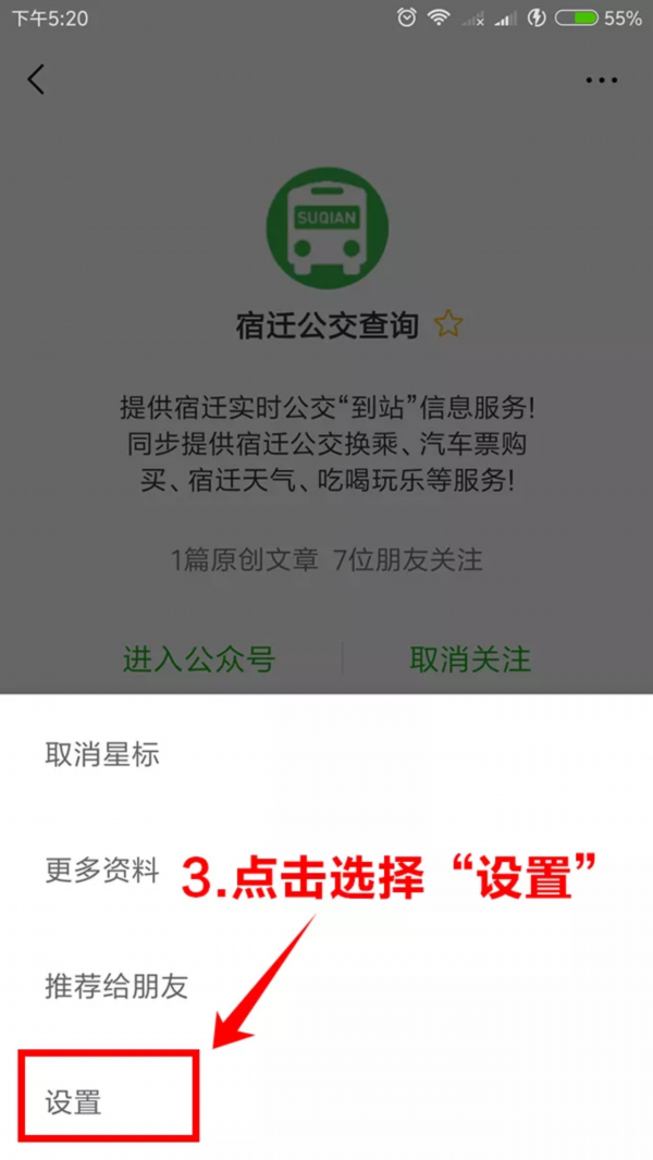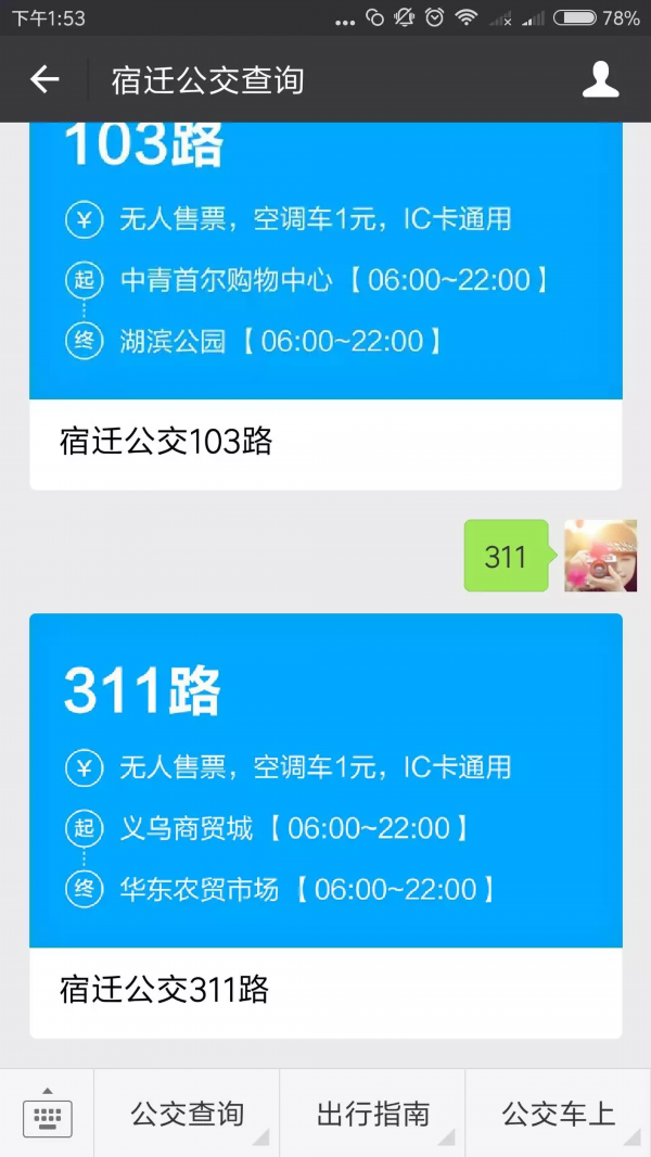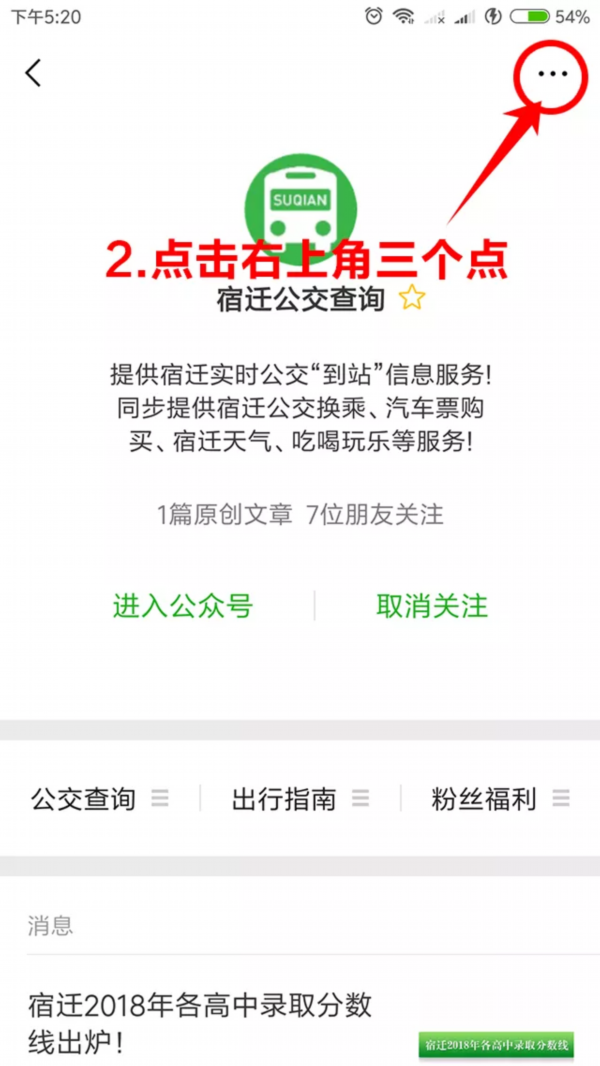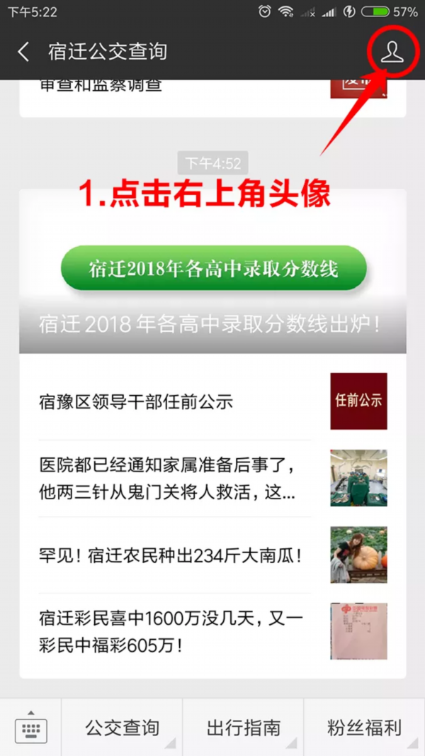 第1步:打开“宿迁公交查询”公众号,点击它的右上角头像。
