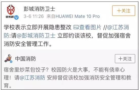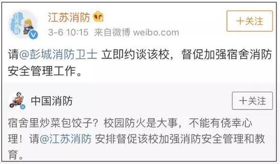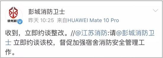 10点15分,@江苏消防:请@彭城消防卫士 立即约谈该校,督促加强宿舍消防安全管理工作。