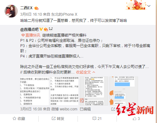 追溯到前一天,3月6日,关于熊猫直播即将破产清算、关闭服务器的消息不胫而走。此外,有爆料称,3月18日,熊猫直播将关闭服务器,统一赔偿半个月工资。不过,截至红星新闻记者发稿,熊猫直播对此尚无回应。