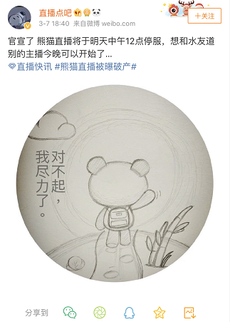 “某平台本月申请破产,基本上18号关闭服务器。”据“直播点吧”3月6日发布的微博内容显示,一位自称熊猫直播员工的人士告诉他,这个平台就是熊猫直播,并且熊猫直播已经进入破产清算环节。 3月7日18时40分,“直播点吧”再次发微博,称“官宣了 熊猫直播将于明天中午12点停服……”
