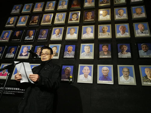 南京大屠杀幸存者伍正禧的儿子伍必宽在熄灯仪式上讲话。紫金山记者 王丽华 摄
