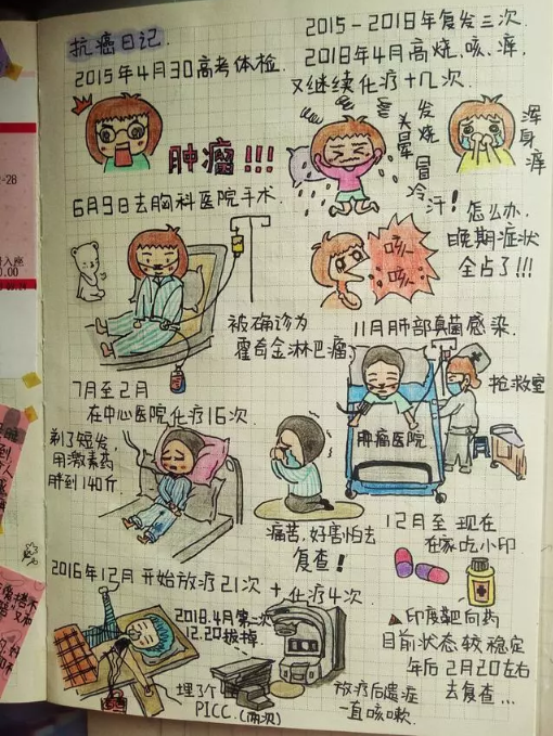 21岁的河南师范大学女生孙莹不幸患癌,乐观的她用漫画的方式记录了自己抗癌治疗过程和内心感触,用自己的抗癌日记鼓励着与她一样遭受病痛折磨的病友。2015年高考后,孙莹便确诊了霍奇金淋巴瘤,而当时,她的父亲已是肺癌晚期,最后,父亲放弃治疗,把家里的钱留给她。孙莹已经抗癌四年,因为没钱错过一次自体干细胞移植的机会,目前正在接受化疗,等待病情好转进行自体干细胞移植,才有痊愈的可能。