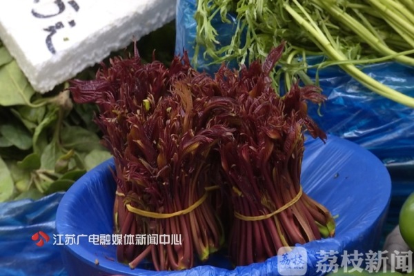 在南京进香河菜场,新鲜上市的野菜都摆在显眼的位置,"七头一脑"中的香椿头最娇贵,价格也最高,上市的时候12块钱1两,现在卖到8块1两,不过这个香椿头可不是南京本地产的,基本上都是昆明的,南京本地的香椿头还要过段时间才能上市。