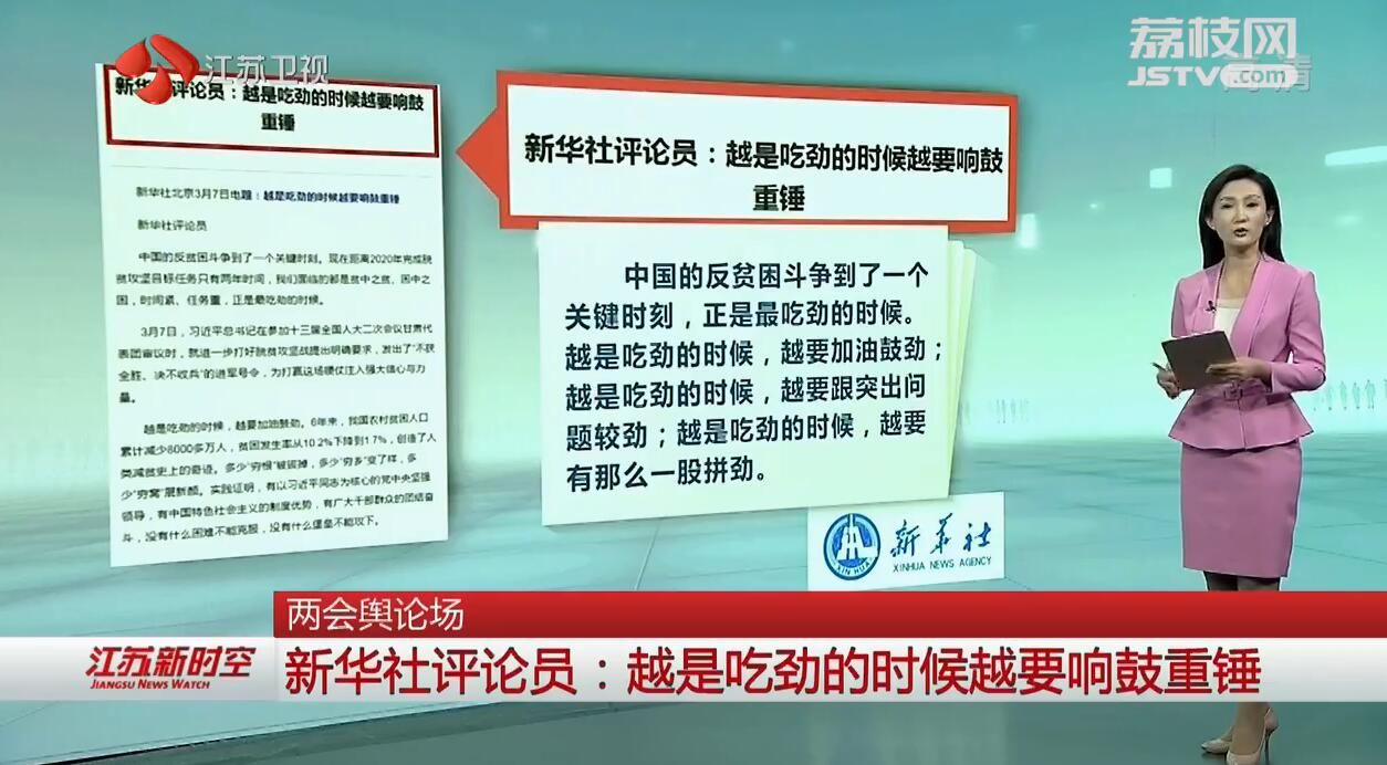 新华社发表评论员文章说,中国的反贫困斗争到了一个关键时刻,正是最吃劲的时候。越是吃劲的时候,越要加油鼓劲;越是吃劲的时候,越要跟突出问题较劲;越是吃劲的时候,越要有那么一股拼劲。