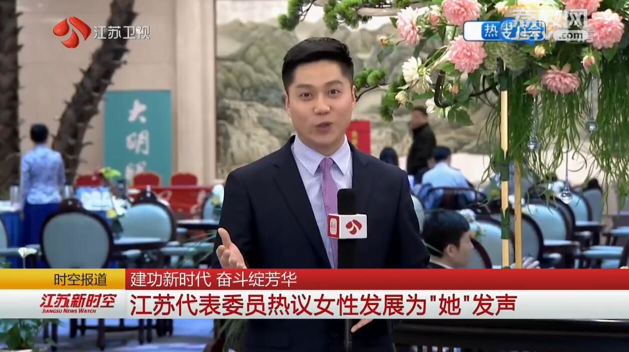 江苏台记者王尧:“这里是江苏团住地国二招宾馆,虽然今天是节日,但女代表们依然在忙碌履职、打磨建议。不少江苏代表为做好新时代的妇女工作建真言、谋良策、出实招。”